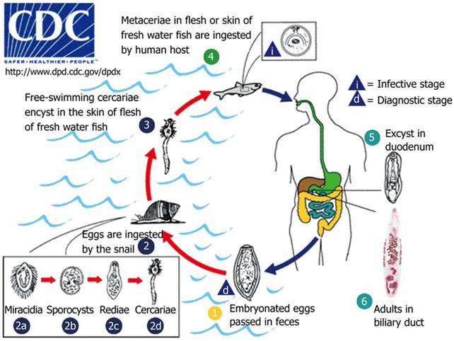 Current status of Clonorchis sinensis and clonorchiasis in China.Lai DH, Hong XK, Su BX, Liang C, Hide G, Zhang X, Yu X, Lun ZR.Trans R Soc Trop Med Hyg. 2016 Jan;110(1):21-7. doi: 10.1093/trstmh/trv100. Review.PMID: 26740359 Similar articlesSelect item 17587442193.