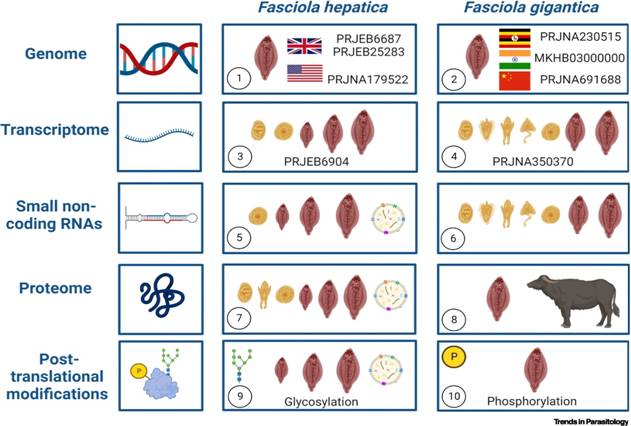 9.Luo X, Cui K, Wang Z, Li Z, Wu Z, Huang W, et al. (2021) High-quality reference genome of Fasciola gigantica: Insights into the genomic signatures of transposon-mediated evolution and specific parasitic adaption in tropical regions. PLoS Negl Trop Dis 15(10): e0009750