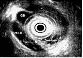 Siêu âm nội soi cho thấy một vòng tròn xoắn ở giữa, bên trong ống mật chủ. |