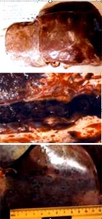 Sán lá gan lớn ký sinh trong đường mật chứa một lượng lớn hạt pigment sậm màu, nhiều bạch cầu hạt và trứng sán màu vàng nâu của loài sán Fasciola hepatica. Bên trong tế bào khổng lồ đa nhân, kết quả này được quan sát dưới kính hiển vi độ phóng đại 10 lần. Với chẩn đoán của AFIP: cho biết gan có tình trạng viêm lan tỏa hoặc khu trú, u hạt xuất hiện quanh tĩnh mạch cửa và trong tĩnh mạch cửa, tăng bạch cầu eosin, tổn thương đa ổ, xơ hóa lan tỏa nghiêm trọng, hóa khoáng, nhiều hạt sắc tố chuyển màu từ nâu sang đen và xuất hiện một số trứng không điển hình ở trên gan bò.