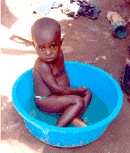 Khi còn nhỏ, sự tiếp xúc nước đầu tiên thông thường xảy ra theo cơ chế thụ động (như được tắm rửa) trước khi chuyển dần dần sang cơ chế chủ động sau này khi đứa trẻ có thể tự ra nước một mình. (a) Thời điểm, địa điểm, và thời gian diễn ra các hoạt động nguy cơ cao tại mép nước có thể được đánh giá dựa vào các thiết bị thu thập dữ liệu GPS, các thiết bị này có thể đeo ở cánh tay hoặc cổ tay của những đối tượng tham gia nghiên cứu, nhờ đó cho phép một máy đo kỹ thuật số theo dõi sự tiếp xúc nước chủ động trên mép nước. (b) Tuy nhiên biện pháp thu thập dữ liệu GPS có thể thất bại do các hành vi cụ thể, ví dụ ở hình bên trái mặc dù đứa bé có thể ở trong vùng không gian có nguy cơ nhiễm bệnh cao nhưng em bé không có nguy cơ trực tiếp vì được địu trên lưng người mẹ; nhưng khi được tắm rửa trong thau đựng nước (hình bên phải) thì lại có nguy cơ cao cho dù khó xác định về không gian ở mép nước ven hồ. |