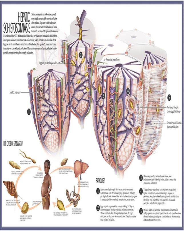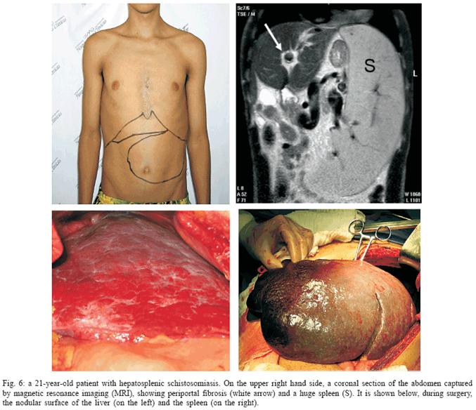 + Tăng áp lực tĩnh mạch cửa với biểu hiện triệu chứng nôn ra máu và lách lớn (chủ yếu do S. mansoni, S. japonicum);