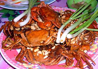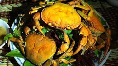 Sau khi chế biến, một đĩa cua đá nướng vàng ruộm bày sẵn lên mâm được mang ra, kèm theo đĩa muối hạt giã nhỏ trộn với hạt tiêu xanh giã nhuyễn là một món ăn ngon và thơm hơn.
