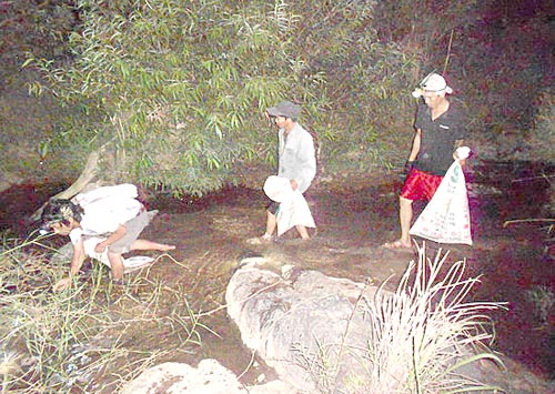 Các nhóm người này thường bắt đầu hành trình lội suối đi bắt cua, vừa lội suối vừa chăm chú rọi đèn xuống nước, không bỏ sót một hốc, kẽ/ khe đá nào. Hễ thấy con cua nào nằm dưới nước là chụp liền, rất nhanh gọn không để con nào thoát. Nếu ngày có mưa to, nước thường hơi đục nên phải soi thật kỹ mới thấy cua được. Nhiều người đi bắt nên cua ngày càng tinh, cứ thấy ánh đèn là chúng bò đi núp liền chứ không phải trơ mình ra chờ mình tới bắt như lúc trước.