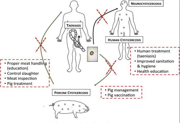 Để ngăn ngừa, phòng chống và khả năng loại trừ SD T. solium, can thiệp y tế công cộng bằng tiếp cận tổng hòa các khía cạnh dịch tễ học, thú ý, sức khỏe con người và môi trường. Tám bước can thiệp để phòng chống SD T. solium có thể dùngphối hợp các biện pháp khác nhau thiết kế trên nền tảng của từng quốc gia: