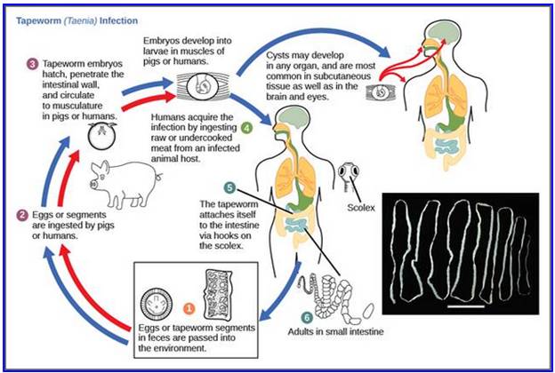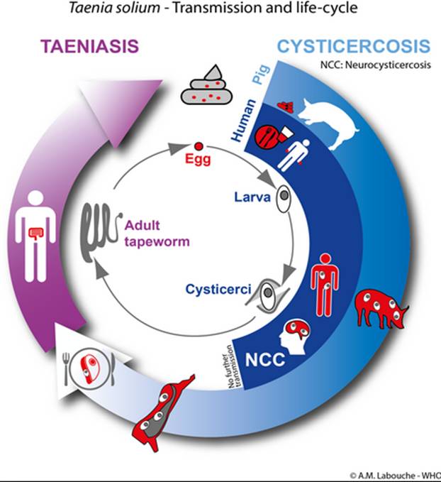 Với ấu trùng sán dây lợn, giai đoạn ấu trùng có thể gây nhiễm trùng tại các bộ phận khác nhau trong cơ thể người. Người mang T. solium là nguy cơ quan trọng bệnh ATSDL do phơi nhiễm với trứng sán dây lợn T. solium thông qua con đường tự nhiễm phân-miệng.