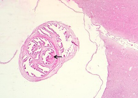 Đầu sán bị lồng và bao ở vị trí mũi tên
