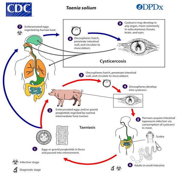 Nếu trứng đẻ ra trong phân của một người nhiễm một cách tình cờdo nuốt phải từ một người đang mắc bệnh sán dây lợn hoặc một người có điều kiện làm việc và sinh sống trong môi trường gần gũi để phơi nhiễm với mầm bệnh và dẫn đế hậu quả. Đường phân miệng này là một mô hình nhiễm là phổ biến nhất, bên cạnh đó còn có một số tác nhân gây bệnh khác, bao gồm cả Norovirus. Trong đường ruột, trứng sán dây T. solium chuyển thành oncospheres, rồi đi xuyên qua thành ruột và di chuyển thông qua hệ tuần hoàn máu đến các mô khác nhau, hầu hết và thường gặp là cơ và hệ thần kinh trung ương. Khi nang sán phát triển trong não hay các phần khác của cơ thể chủ yếu là cơ và hệ thần kinh trung ương, dẫn đến bệnh ấu trùng sán dây lợn thể thần kinh với ước tính 2,5 - 8,5 triệu người trên toàn cầu đang bị thể bệnh này.