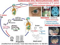 ·Do phản ứng viêm quanh các nang (một dấu hiệu của việc thoái hóa do ký sinh trùng gây ra bởi thuốc kháng giun sán) nên việc sử dụng thuốc điều trị kháng giun, sán phải thường kết hợp với các thuốc kháng viêm.