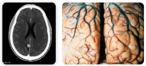Hình 2. Nang sán trong nhu mô não và hình ảnh trong nhu mô não khi mổ |Nguồn: Radiologie, 2016