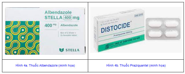 ·Việc sử dụng thuốc kháng giun, sán được khuyến cáo điều trị cho giai đoạn nang u hạt (thể còn sống) hay nang keo (thoái hóa). Không khuyến cáo điều trị thuốc cho giai đoạn nang vôi hóa (ký sinh trùng đã chết).