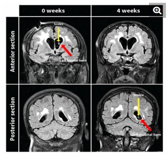 Đầu sán (scolex) có thể nhìn thấy trong phần trước của não ở thời điểm tuần 0 và phần sau của não