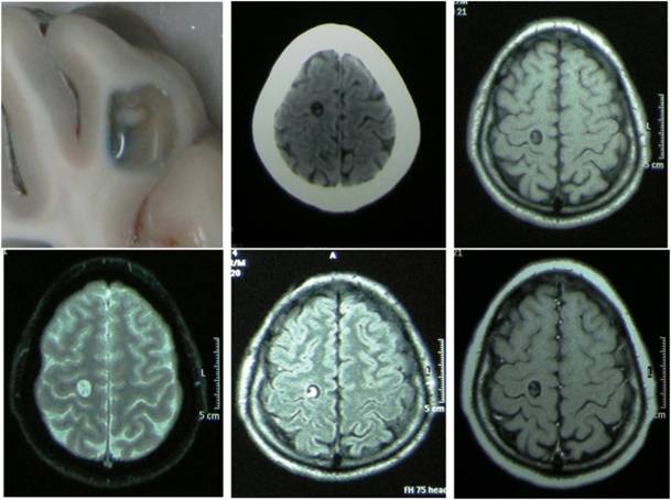 thể thần kinh cho thấy sự dịch chuyển các nang áu trùng trong não thất (intraventricular larval cyst)