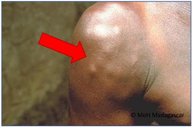 Nang sán dưới da: Ở vị trí da, nang sán có dạng hình cầu, nhẵn, tạo khối sưng cứng và di động, đường kính 1 - 2cm (Hình 2). Khối thường không đau và không viêm. Hóa trị dự phòng không gây nguy cơ gì cho sự ký sinh này, nhưng vì nó có thể liên quan đến thể bệnh thần kinh nên không khuyến cáo dự phòng.