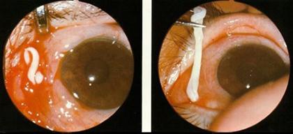 Khi ấu trùng sán vào trong mắt tạo ra một phản ứng căng nhức, nhất là phù quanh nhãn cầu, có thể đến mù nếu không can thiệp kịp thời vì ký sinh trùng di chuyển vào đến kết mạc và vào trong ổ mắt. Trong các mô ở ổ mắt, ấu trùng nằm lại phía cực sau gây phản ứng viêm, dẫn đến lồi mắt và thị lực bị ảnh hưởng, một số ca có loét giác mạc. Nói chung thể này thường gây đau mắt, nhức, kích thích, loét giác mạc chảy nước mắt, sưng phù đáng kể mi mắt.