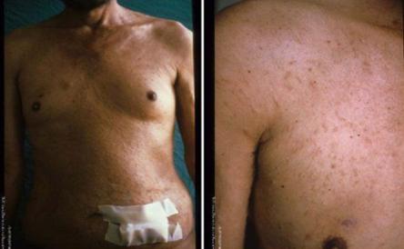 | Hình 13.Tổn thương sán nhái Spirometra spp. ở bìu và một bên của vú |