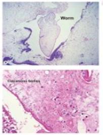 Hình 12. Ấu trùng sán nhái gây thương tổn nhiều vị trí khác nhau trên nhu mô não