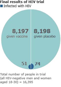 Tất cả những người này đều không bị nhiễm HIV lúc tham gia công trình nghiên cứu; họ được chia thành 2 nhóm một cách ngẫu nhiên: 8197 người được tiêm 6 liều vaccine RV144, 8198 người dùng giả dược (tức placebo). Sau 3 năm theo dõi, kết quả như sau: