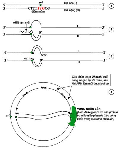 Tại điểm mầm oriV, sợi nhẹ (L) và sợi nặng (H) được bung ra (bước 1), một đoạn ARN được nhanh chóng tổng hợp và làm mồi để tổng hợp sợi nặng (hay sợi dương), rồi sau đó là tổng hợp sợi nhẹ (hay sợi âm) (các bước 2, 3). Đối với sợi âm, ADN của plasmid được tổng hợp từng phân đoạn (còn gọi là phân đoạn Okazaki) và cuối cùng được gắn lại với nhau, sau khi loại bỏ ARN làm mồi (bước 4) (Xem chi tiết trong bài).