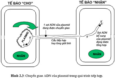 Ngay lập tức lúc đó, theo cơ chế mở vòng nói chung của ADN như đã trình bày, tức là có sự tham gia của men ADN-gyraza phụ thuộc ATP (lấy năng lượng từ ATP), ADN của plasmid được mở vòng tại điểm mầm oriV, hay còn gọi là điểm mầm sinh trưởng (vegetative origin). Sợi dương ADN của plasmid được tách ra và luồn qua ống rỗng protein đang làm cầu tiếp hợp giữa 2 tế bào (còn gọi là lông giới tính hay sex pili), chuổi ADN được chuyển giao ngay lập tức với đầu 5¢ của ADN đi trước luồn sang tế bào vi khuẩn “nhận”. Vòng ADN trong tế bào “cho”, quay theo hướng quay tròn (rolling circle), và sợi dương tiếp tục được chuyển giao cho đến khi kết thúc (Hình 2.3).