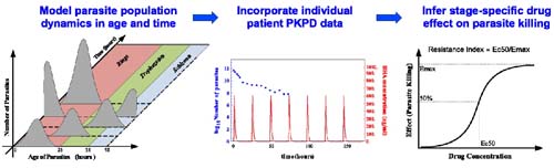 Một mô hình toán học đã phát triển, mô tả mối liên quan dược động học - dược lực học đặc hiệu giai đoạn của ký sinh trùng bên trong vật chủ. Các thông số mô hình này được ước tính dựa vào dữ liệu làm sạch ký sinh trùng và dược động học chi tiết từ 39 bệnh nhân sốt rét do P. falciparum chưa biến chứng được điều trị bằng artesunate tại Pailin (tây Campuchia) nơi mà kháng artemisinin là một bằng chứng và 40 bệnh nhân từ Wang Pha (phía tay bắc của Thái Lan) nơi mà hiệu lực được bảo tồn. Mô hình toán học để quan sát việc làm sạch ký sinh trùng cho mỗi bệnh nhân với khoảng độ chính xác (rmsd: 0.03–0.67 in log10 scale).