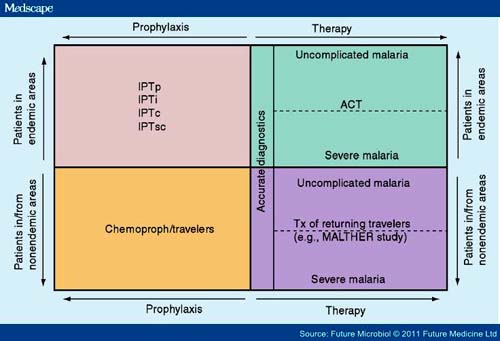 Nhóm tác giả Nicholas M Douglas, Nicholas M Anstey, Brian J Angus, Francois Nosten, Ric N Price cho biết chẩn đoán sớm và điều trị kịp thời sốt rét bằng thuốc phối hợp ACTs là một trong những khâu then chốt trong các chiến lược loại trừ sốt rét trên toàn cầu. Nhìn chung, sử dụng ACTs còn giới hạn đối với các bệnh nhân sốt rét do P. falciparum, ngược lại đối với sốt rét do Plasmodium vivax thì hầu hết chỉ còn dùng chloroquine.