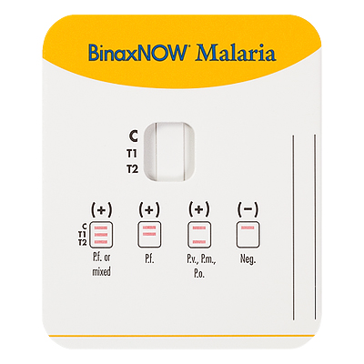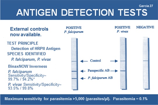 Trong test chẩn đoán nhanh sốt rét (BinaxNOWMalaria Test; Binax, Inc., Scarborough, ME, USA), mẫu máu của bệnh nhân là âm tính với protein 2 giàu histidine (HRP2) của P. falciparum nhưng đã có phản ứng dương tính với kháng nguyên aldolase pan- malaria, điều này đề nghị và nghĩ đến bệnh nhân nhiễm Plasmodium spp. nhưng không phải P. falciparum.