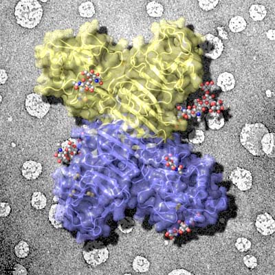 Mặt bên ngoài của protein NS1 flavivirus (đường ở trong các quả bóng màu xám) bị phơi nhiễm trên bề mặt các tế bào bị nhiễm bệnh mà nó có thể tương tác với hệ miễn dịch. Bề mặt này cũng bị phơi nhiễm với các hạt NS1được bài tiết hiện diện trong huyết thanh bệnh nhân. Hình nền cho thấy màng nhân tạo bao phủ protein NS1. |
