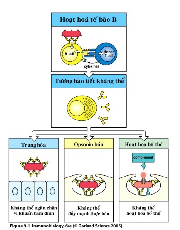 Các KT có thể ngăn cản khả năng dính bám của vi sinh vật với bề mặt của tế bào thực bào, trung hòa độc tố, hoạt hóa bổ thể làm ly giải tế bào đích, opsonin hóa làm tạo điều kiện cho sự thực bào. Khi lympho B được kích thích bởi các kháng nguyên (KN), chúng sẽ được biệt hóa tạo ra các tương bào sản sinh ra KT. Sự tương tác giữa KN và tế bào lympho B có thể xảy ra bởi 2 cơ chế: