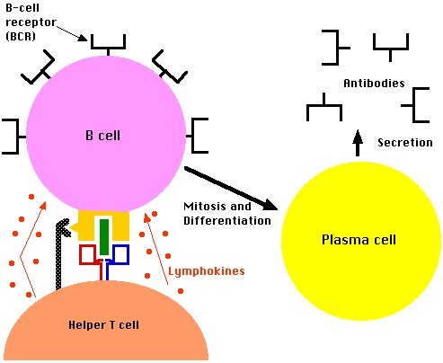Các tế bào lympho B khi đã kết hợp được với KN sẽ nhận được được một tín hiệu khởi động để biệt hóa thành tương bào, là các tế bào có tiềm năng sinh kháng thể.