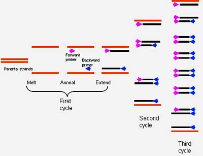 Sau khi các chuỗi bổ sung đã được tổng hợp xong, hai chuỗi kép được tạo thành qua quá trình này sẽ lại được phân tách ra và quá trình tổng hợp được lặp lại như trên để sản sinh ra 4 chuỗi và cứ như thế tiếp diễn. Bằng cách sử dụng một loại polymerase DNA bền với nhiệt Hemophilus aquaticus, có thể trộn lẫn bệnh phẩm với các tiền chất deoxynucleotid mồi thử cho hai chuỗi và polymerase, sau đó hỗn hợp này được đưa vào chu trình xử lý bằng nhiệt độ thích hợp với sự phân tách chuỗi, tiếp cận mồi và tổng hợp các chuỗi bổ sung. Trong vòng 60 phút, sự khuyếch đại có thể lên tới 1 triệu lần. DNA khuyếch đại dễ dàng được phát hiện bằng chất dò đặc hiệu.
