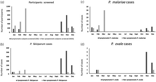 Hơn 4000 người tham gia được phân bố thành hai nhóm: Nhóm có triệu chứng (n=2145) và Nhóm không triệu chứng (n=2025) đã được sàng lọc trong nghiên cứu này (Hình 1). Người tham gia được tuyển chọn trong mùa lan truyền thấp (tháng 1 - 3 và tháng 10 - 12), cho phép phát hiện các trường hợp đơn nhiễm các loài không phải P. falciparum (Hình 2a). Kết quả P. falciparum được phát hiện nhiều nhất chủ yếu ở trên những người tham gia có triệu chứng vào cuối mùa lan truyền sốt rét cao từ tháng 10 đến tháng 12, tương tự như P. ovale (Hình 2b và d).