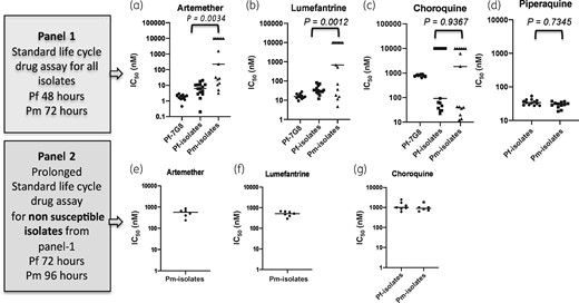 IC50 của (a) Artemether, (b) Lumefantrine, (c) Chloroquine và (d) Piperaquine đối với P. malariae và P. falciparum. IC50 của (e) Artemether, (f) Lumefantrine và (g) Chloroquin từ thử nghiệm kéo dài thuốc 24 giờ đối với các bản phân lập thực địa