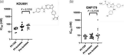 Khi các chủng phòng thí nghiệm 7G8 P. falciparum tiếp xúc với KDU691, thuốc có khả năng ức chế cao (IC50 trung bình = 24,91 nM). Đối với các chủng phân lập từ thực địa, KDU691 ức chế hiệu quả cả P. malariae (IC50 trung bình = 66,56 nM) và P. falciparum (IC50 trung bình = 48,015 nM) (Hình 4a). Thú vị là giống như KDU691, imidazolopiperazine GNF179 cũng có tác dụng mạnh đối với cả P. malariae (IC50 trung bình = 10,04 nM) và P. falciparum (IC50 trung bình = 6,37 nM) so với chủng phòng thí nghiệm 7G8 P. falciparum (IC50 trung bình = 7,38 nM) (Hình 4b). Do đó, độ nhạy cảm của P. malariae không khác biệt so với P. falciparum khi tiếp xúc với KDU691 và điều trị GNF179 (lần lượt là P = 0,7255 và P = 0,2726) (Hình 4a và b).