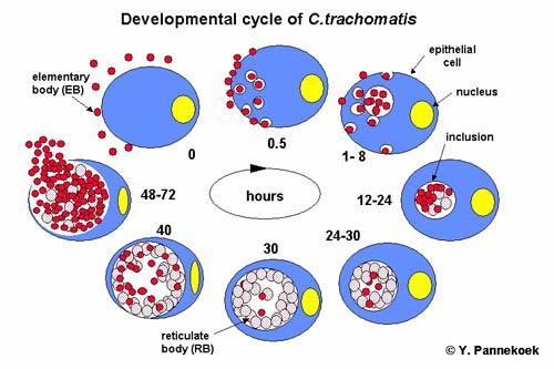 Chu kỳ sinh học và phát triển của vi khuẩn Chlamydia ở trên cho thấy Chlamydiae có khả năng thiết lập một mối liên quan với các tế bào vật chủ trong thời gian dài. Khi một tế bào vật chủ bị nhiễm thì chlamydia sẽ rất thiếu nhiều chất dinh dưỡng khác nhau như các a.a (ví dụ tryptophan) sắt, vitamine, điều này do Chlamydiae sống phụ thuộc vào chất dinh dưỡng của các tế bào này. Một nghiên cứu thuần tập thời gian dài chỉ ra rằng khoảng 50% các vật chủ này sạch vi khuẩn trong vòng 1 năm, 80% trong 2 năm và 90% trong 3 năm.