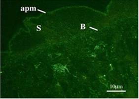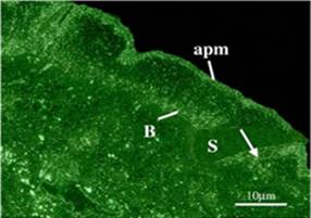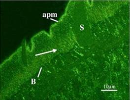 Hinh 1: dải băng đậm vỏ sán nằm bên dưới cấu trúc màng bào tương Và bên trênmàng đáy (B). Hợp bào gần gai (S) cho hình ảnhphát quang. | Hình 2: Những con sán nhạy cảm với TCBZ (liều 15μg/ml/24 giờ) dải băng phát quang nhạt bên dưới apm và bên trên trụ gai (S). |