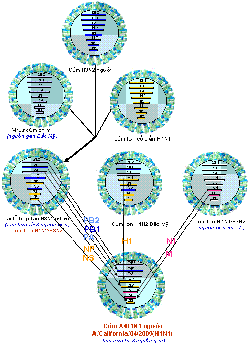 Cúm A/H1N1 – 2009 được hình thành sau hai quá trình tam hợp, đó là phân type của một tổ hợp các phân đoạn gen có mức độ biến đổi khác rất nhiều so với cúm A/H1N1 vốn vẫn đang lưu hành ở châu Mỹ trong các năm trước đó (cho đến 2008), đặc biệt đối với các gen kháng nguyên H1 và N1 (Gallaher, 2009; Shinde et al., 2009; Zimmer, Burke, 2009). Nguồn gốc tiến hóa tái tổ hợp tạo nên cúm A/H1N1 của người năm 2009 đặc trưng bằng sự trộn lẫn hỗn tạp của nhiều dòng gen từ cúm chim, người, lợn để tạo nên các chủng trung gian tái tổ hợp, cung cấp các phân đoạn gen cho sự hình thành cúm A/H1N1 ngày nay (Smith et al., 2009) (Bảng 1).