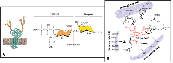 Hình 3. Thụ thể tế bào và liên kết sialic acid của thụ thể với hemagglutinin. A. Phân tử thụ thể bề mặt cắm gốc vào màng tế bào và sialic acid được gắn vào cuối của chuỗi polypeptide thụ thể; sialic acid liên kết với galactose tạo nên góc quay α2,3 hoặc α2,6 tiếp nhận HA (hemagglutinin), mà ở giữa là điểm cắt của enzyme neuraminidase (NA). B. Mô hình liên kết hemagglutinin với sialic acid; các amino acid 224-228 và 135-138 của phân tử HA tạo nên “hốc lõm” liên kết với sialic acid (Nguồn: Expert Reviews in Molecular Medicine (2001): http://www-ermm.cbcu.cam.ac.uk). |