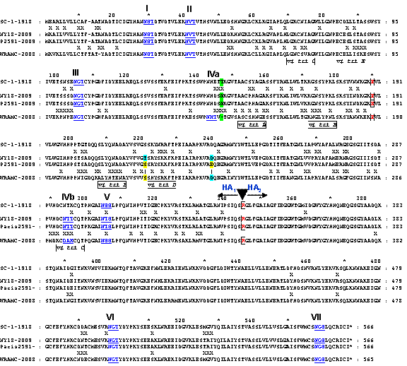 Hình 4. So sánh đối chiếu trình tự amino acid protein hemagglutinin (HA(H1)) của virus cúm A/H1N1 năm 2009 (virus đại dịch cúm 2009) và năm 2008 phân lập trên người. Ghi chú: Gen H1 của các chủng so sánh bao gồm: hai chủng virus H1N1 mới phát sinh đại diện đại dịch cúm năm 2009 là A/New York/18/2009(H1N1), phân lập tại Mỹ (số đăng ký: FJ984355) và A/Paris/2591/2009(H1N1), phân lập tại Pháp (số đăng ký: GQ249333); một chủng virus H1N1 gây đại dịch năm 1918 là A/South Carolina/1/18(H1N1) (số đăng ký: AF117241); và một chủng virus H1N1 cũ ở người năm 2008 là A/DistColumbia/WRAMC-1154048/2008(H1N1) phân lập tại Mỹ (số đăng ký:CY038770). Hai chủng H1N1 - 2009 của Mỹ (châu Mỹ) và Pháp (châu Âu) chỉ sai khác amino acid tại vị trí 221 (T221S) và 240 (D240E) được sử dụng song đôi để so sánh với chủng H1N1 - 1918 (ký hiệu: SC-1-1918) và H1N1-2008 (ký hiệu: WRAMC-2008). Sai khác amino acid khi so sánh song đôi được đánh dấu (X); đột biến mất một amino acid ở vị trí 13 và 147 được biểu hiện bằng dấu (-). Amino acid arginine (R) của điểm cắt protease đánh dấu bằng mũi tên đứng, giữa HA1 và HA2, cũng như amino acid Glutamic acid (E) thiết yếu cho liên kết với sialic acid được bôi đậm và đóng khung. Các amino acid tham gia vào 5 vùng epitope kháng nguyên được đánh dấu chỉ dẫn bằng khung tên là vị trí A-E. Các vị trí glycosyl hóa gồm 3 amino acid (N-X-S/T) được bôi đậm, đánh số La mã bên trên và gạch bên dưới. |