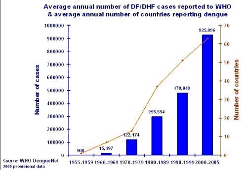Theo thông tin từ ngày 5 tháng giêng năm 2009, Tổ chức Y tế thế giới (WHO_World Health Organization) thông báo về sốt xuất huyết đã gây nhiễm trên 50 triệu người trên toàn cầu hằng năm, giết chết hàng ngàn người. Bệnh rất phổ biến trên các quốc gia vùng nhiệt đới, và dường như có xu hướng trỗi dậy (resurgence) trong vài thập niên qua.