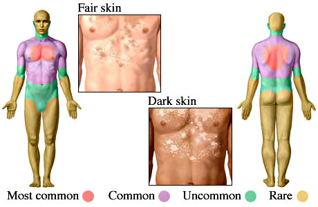 -Tổn thương của bệnh đặc trưng bởi những vùng sáng do giảm sắc tố, đôi khi chúng có màu vàng hoặc hồng.