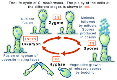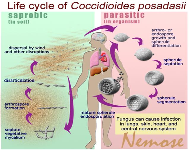 -Các bào tử đốt gây nhiễm trùng phổi tạo thành các thể hình cầu bên trong chứa hàng trăm các bào tử vô tính. Khi thể cầu trưởng thành, sẽ vỡ ra và giải phóng các bào tử vô tính;