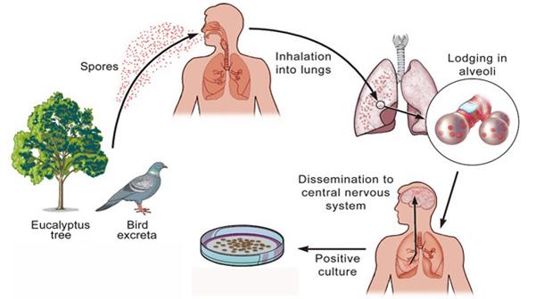 +Lây truyền qua đường hô hấp bởi các bào tử dính dạng nhỏ.