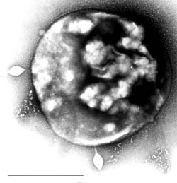 Ba loại virus: virus của vi khuẩn, còn gọi là thực khuẩn thể (trái); virus của động vật (phải trên); và retrovirus (virus phiên mã ngược, phải dưới) |
