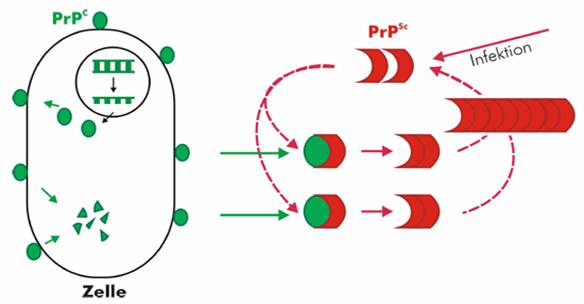 Prions được đặt giả thuyết là có gây nhiễm và khả năng lây truyền bệnh do sự gấp khúc bất thường các protein thành một loại cấu trúc có khả năng chuyển đổi các phân tử bình thường của protein thành các dạng cấu trúc bất thường. Tất cả prion đã biết liên quan đến sự hình thành các nếp của amyloid, trong đó tổng hợp lên protein polymerises thành chuỗi beta. Sự thay đổi cấu trúc này là rất ổn định và tích tụ bên trong các mô bị nhiễm, gây tổn thương các mô và gây chết tế bào. Tính ổn định có nghĩa là prions đề kháng với quá trình làm biến tính (denaturation) bởi các tác nhân hóa học và lý học, khiến cho việc loại bỏ và loại trừ các phần tử này rất khó.