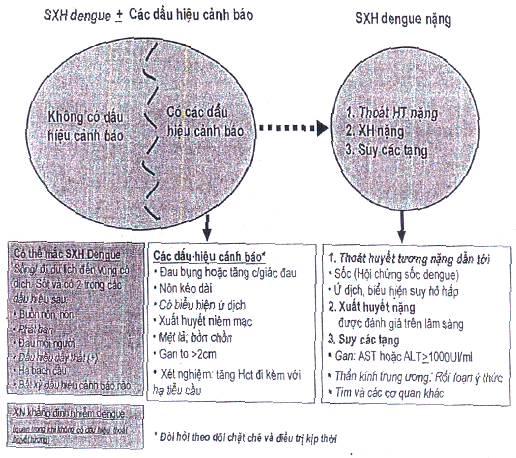 Bao gồm các triệu chứng lâm sàng của sốt xuất huyết Dengue, kèm theo các dấu hiệu cảnh báo như vật vã, lừ đừ, li bì. Đau bụng vùng gan hoặc ấn đau vùng gan. Gan to > 2 cm. Nôn nhiều. Xuất huyết niêm mạc. Tiểu ít. Xét nghiệm máu: Hematocrit tăng cao và tiểu cầu giảm nhanh chóng. Nếu người bệnh có những dấu hiệu cảnh báo trên phải theo dõi sát mạch, huyết áp, số lượng nước tiểu, làm xét nghiệm hematocrit, tiểu cầu và có chỉ định truyền dịch kịp thời.