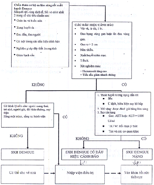 Tại phòng điều trị: Nếu người bệnh sốt xuất huyết Dengue cảnh báo và không uống được thì truyền dịch theo sơ đồ hướng dẫn. Nếu người bệnh có sốc sốt xuất huyết Dengue thì tiến hành điều trị khẩn trương theo hướng dẫn.