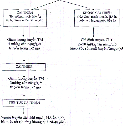 - Nếu mạch rõ, huyết áp hết kẹt, cho dung dịch cao phân tử 10 ml/kg cân nặng/giờ và xử trí tiếp theo như sốt xuất huyết Dengue còn bù.
