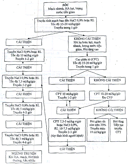 - Cách thức truyền: Phải thay thế nhanh chóng lượng huyết thanh mất đi bằng Ringer lactat hoặc dung dịch NaCl 0,9%, truyền tĩnh mạch nhanh với tốc độ 15-20 ml/kg cân nặng/giờ. Đánh giá lại tình trạng người bệnh sau 1 giờ; truyền sau 2 giờ phải kiểm tra lại hematocrit: Nếu sau 1 giờ người bệnh ra khỏi tình trạng sốc, huyết áp hết kẹt, mạch quay rõ và trở về bình thường, chân tay ấm, nước tiểu nhiều hơn, thì giảm tốc độ truyền xuống 10 ml/kg cân nặng/giờ, truyền trong 1-2 giờ; sau đó giảm dần tốc độ truyền xuống 7,5ml/kg cân nặng/giờ, truyền 1-2 giờ; đến 5ml/kg cân nặng/giờ, truyền 4-5 giờ; và 3 ml/kg cân nặng/giờ, truyền 4-6 giờ tùy theo đáp ứng lâm sàng và hematocrit. Nếu sau 1 giờ truyền dịch mà tình trạng sốc không cải thiện (mạch nhanh, huyết áp hạ hay kẹt, tiểu vẫn ít) thì phải thay thế dịch truyền bằng dung dịch cao phân tử. Truyền với tốc độ 15-20 ml/kg cân nặng/giờ, truyền trong 1 giờ. Sau đó đánh giá lại: