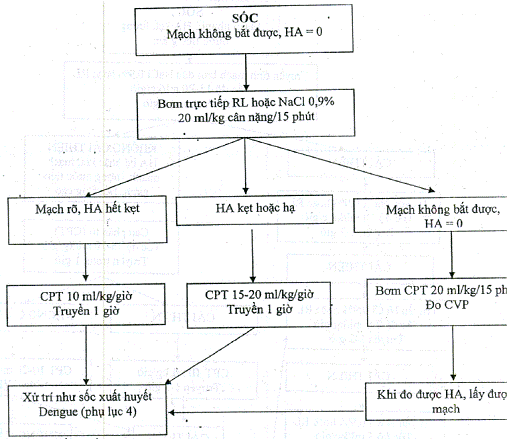 (Xem Phụ lục 6: Sơ đồ truyền dịch sốc sốt xuất huyết Dengue nặng ở trẻ em). Đối với người bệnh ≥ 15 tuổi truyền dịch theo Phụ lục 7).